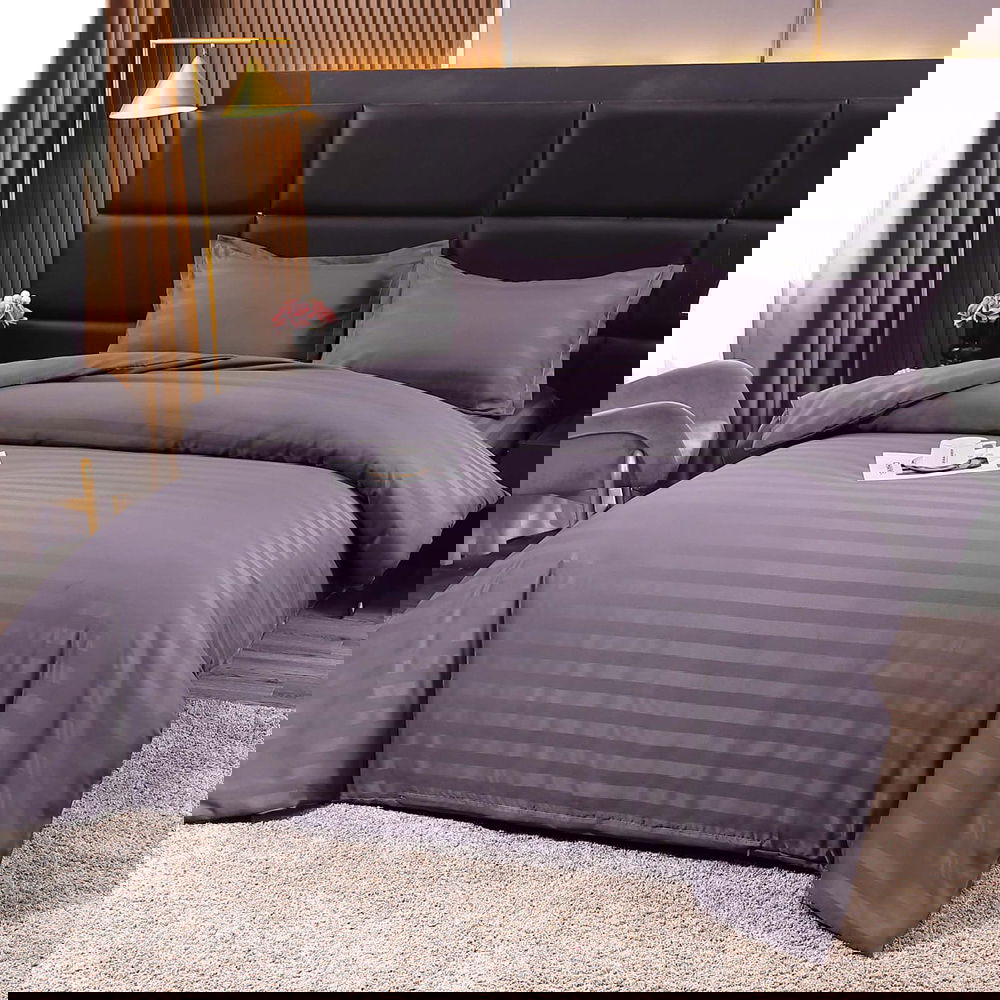 Lenjerie de Pat din Bumbac Turcesc cu Elastic 160/180x200 - 4 Piese - Maro Deschid cu Gri - LBURT002