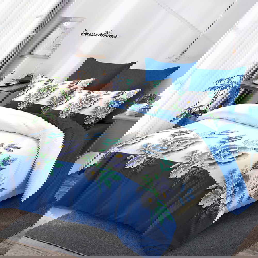 Lenjerie de Pat din Finet cu Elastic 6 Piese - 160/180x200 cm - Bordura Albastra cu Flori - LFEM_C142