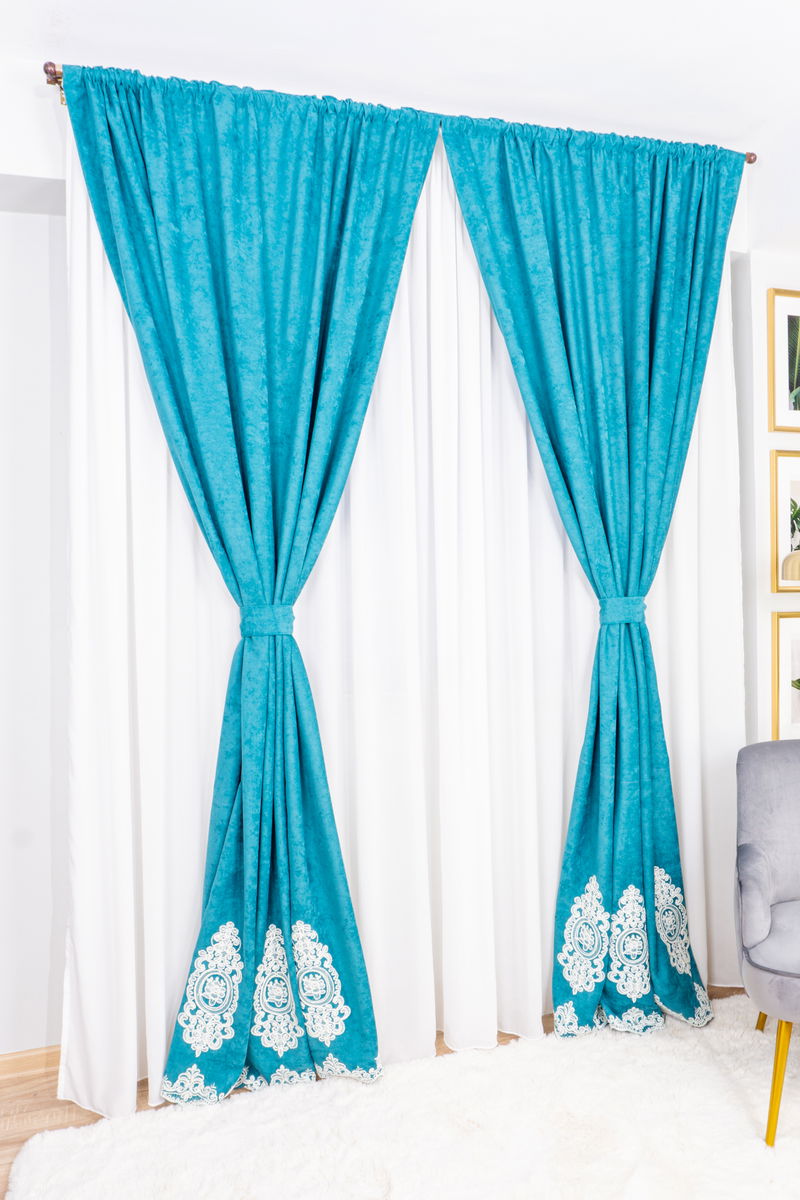 Set 2 Draperii din Catifea Turcoaz Blue cu Model Imperial Alb 145X270cm cu Rejansa - CTFD018B_145X270_ATL