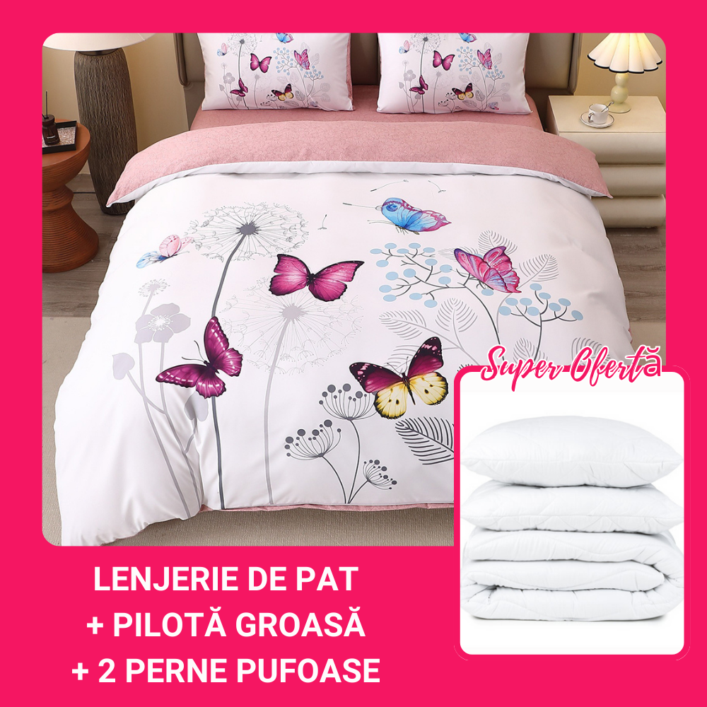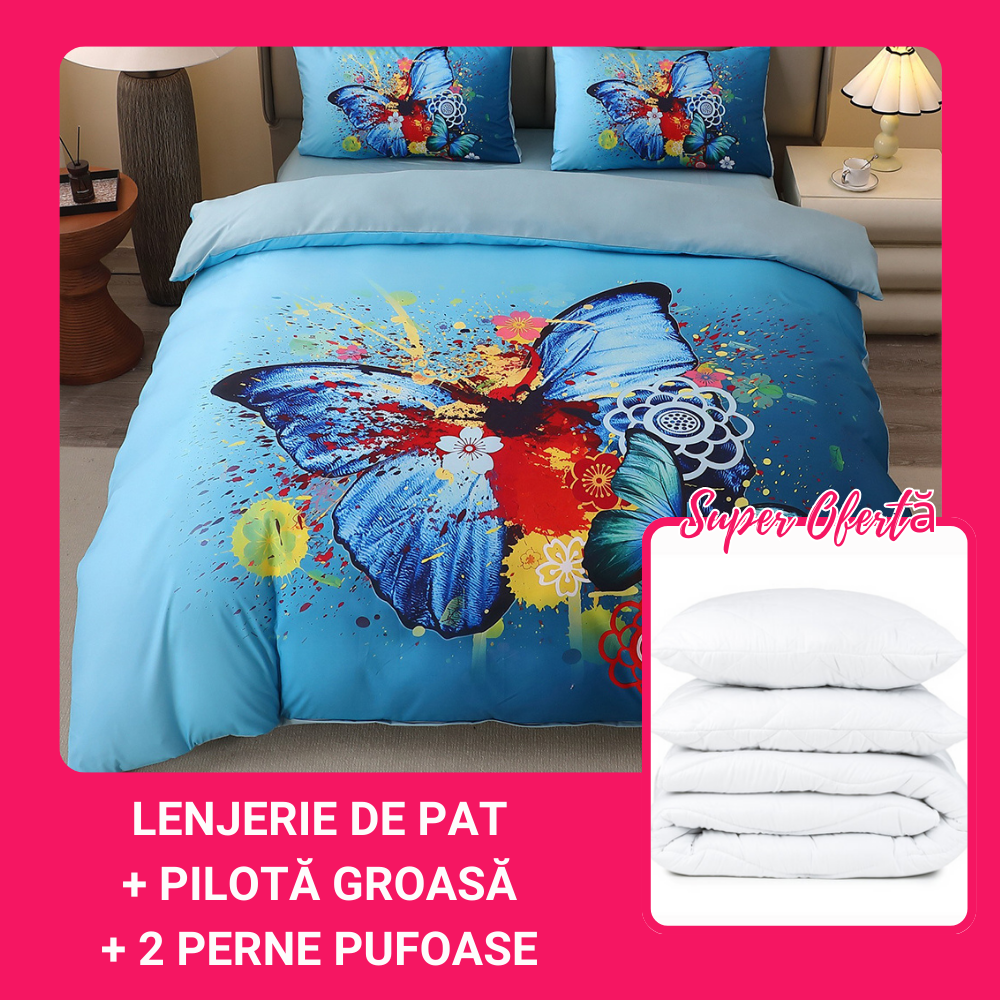 Set CADOU - Lenjerie din Finet 5D cu Elastic - 4 Piese + Pilota Groasa + 2 Perne 50x70 cm - Fluturi Pictati - LFDEB_A104C
