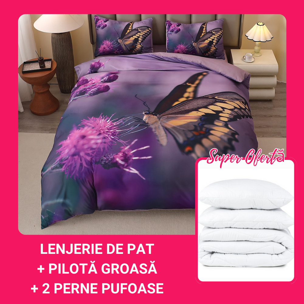 Set CADOU - Lenjerie din Finet 5D cu Elastic - 4 Piese + Pilota Groasa + 2 Perne 50x70 cm - Fluturi si Flori Mov - LFDEB_A106C