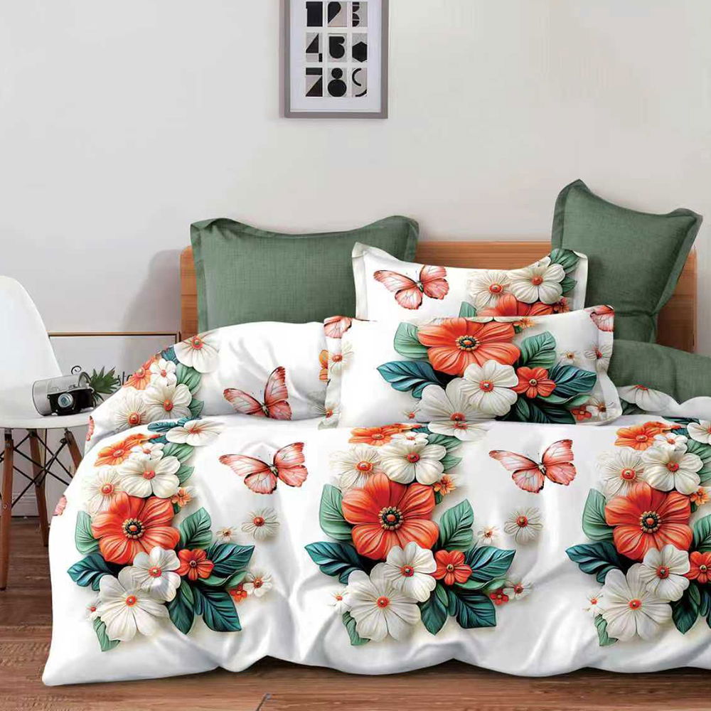 Lenjerie de Pat din Finet cu Elastic 6 Piese - 160/180x200 de Pucioasa - Flori Portocaliu si Alb - LFER_A079C