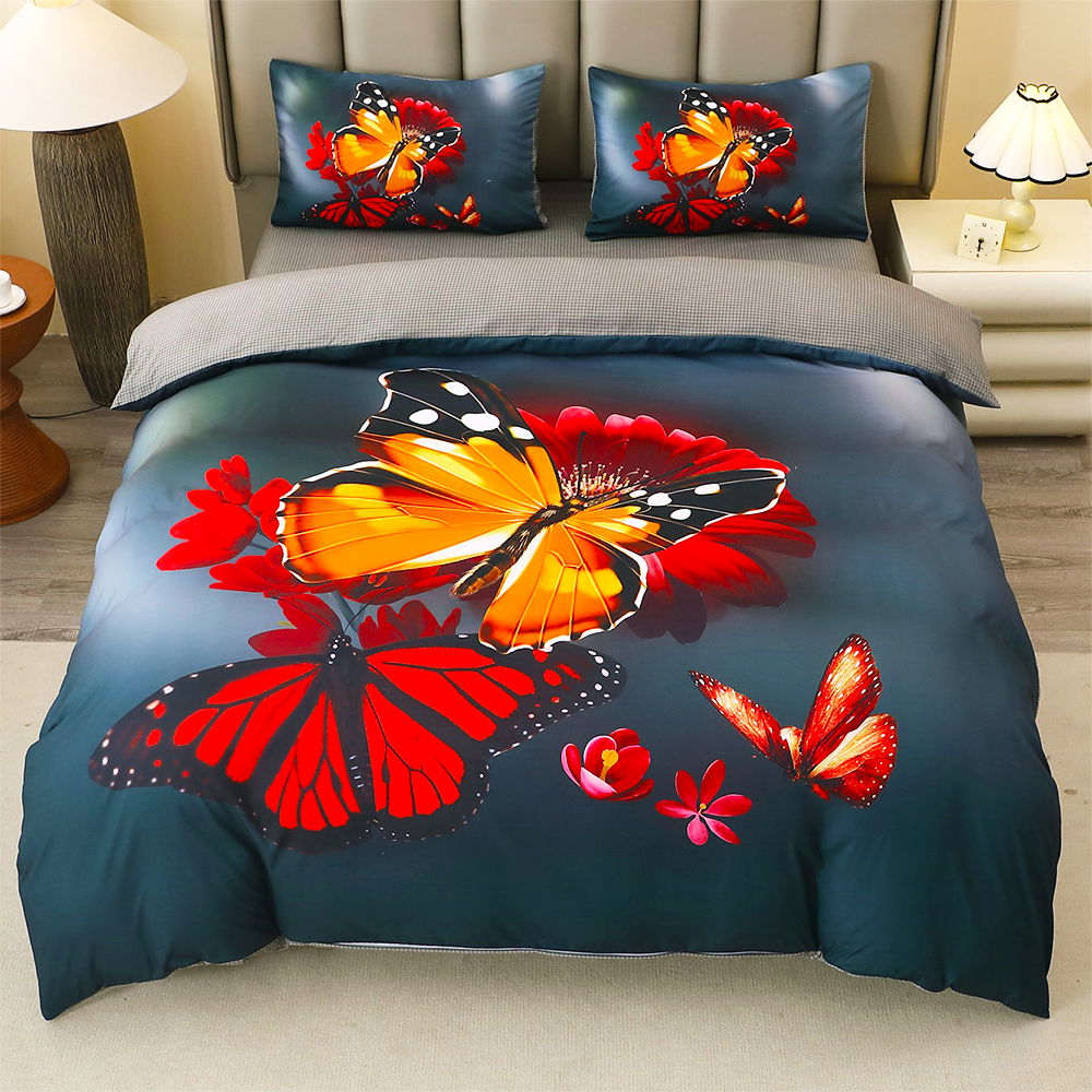 Lenjerie Gri cu Fluturi Portocalii din Finet 5D cu Cearceaf Elastic 160/180x200cm, 4 Piese - LFDEB_A107C