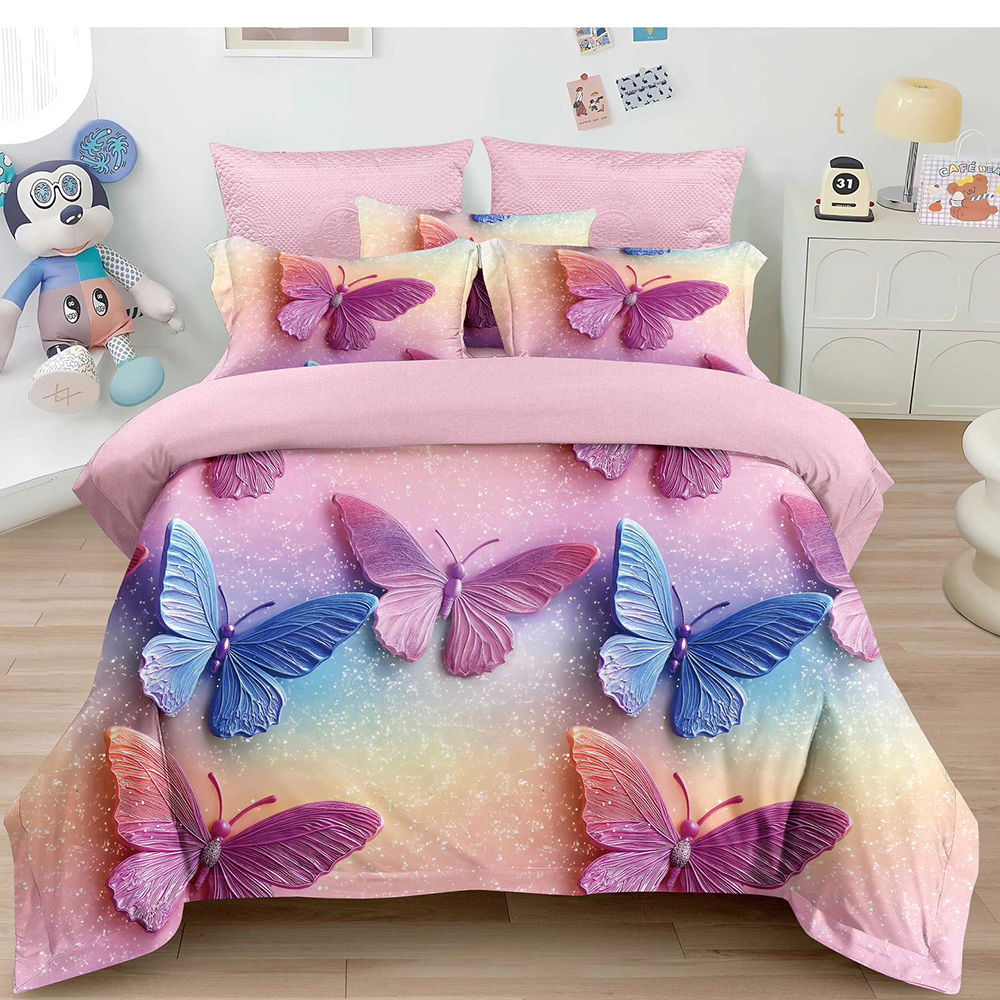 Lenjerie Roz Pudra cu Fluturi din Finet 5D cu Cearceaf Elastic 160/180x200cm, 4 Piese - LFDEB_A102C