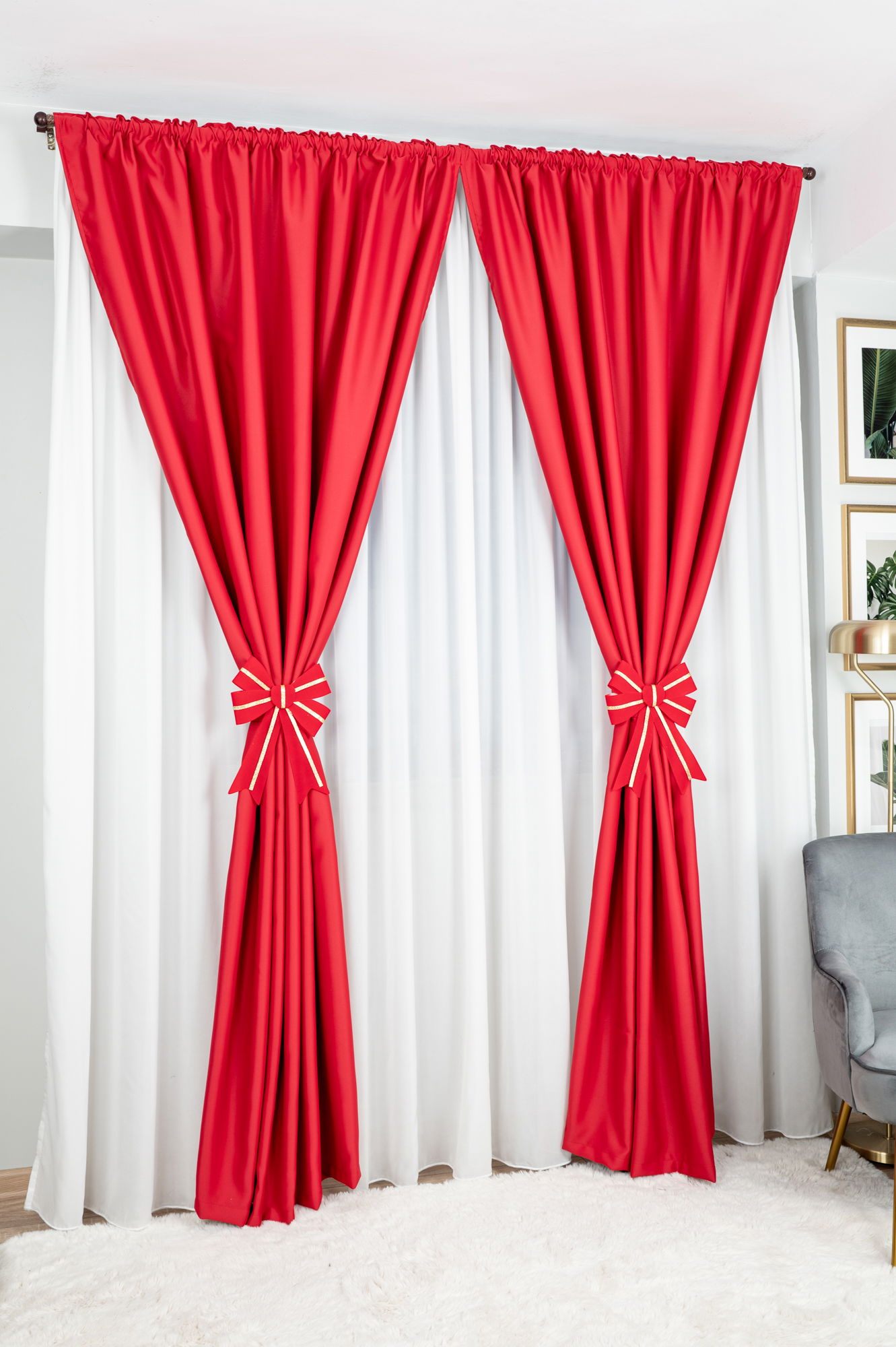 Set Special de Craciun - Draperie Rosie si Perdea Alba din Matase cu Fundite Cadou