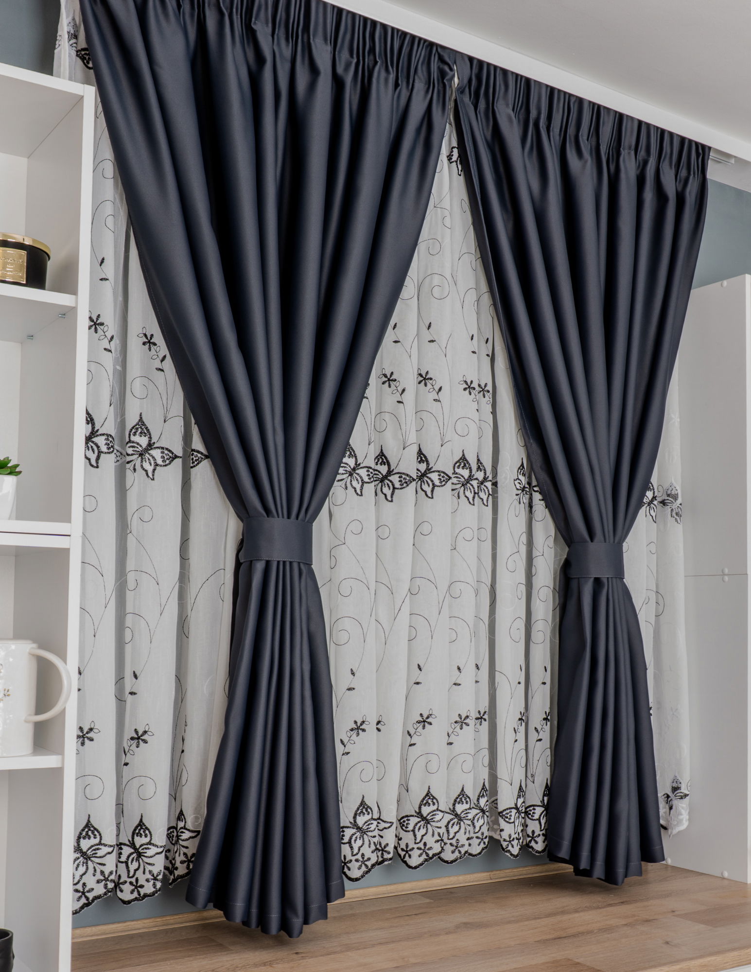 Set Bucatarie Jenny - Perdea de Bucatarie - Zborul Fluturilor Negru cu Alb si Draperie Blackout Gri Plumb Inchis